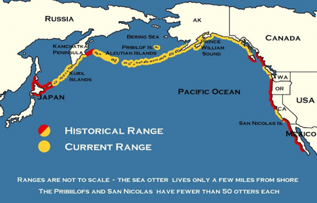 海獭的地理范围波动在过去的300年。在最大的范围横跨整个环太平洋北部从南加州地区的日本。这丰富的人口一直持续到1700年代早期的狩猎水獭的皮毛开始普及。俄国毛皮商人继续走到西海岸从阿拉斯加到加利福尼亚,在很短的时间内俄罗斯永久定居了罗斯在索诺玛堡海岸。这狩猎熄灭海獭人口压力纵观其历史的南部部分范围,从俄勒冈到加州。