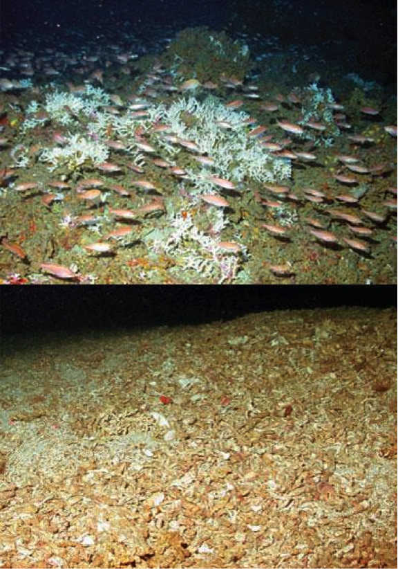 Oculina珊瑚礁:上面的照片-左原状,下面照片:拖网捕鱼。信贷:r·g·吉尔摩(左)和NURC / UNCW