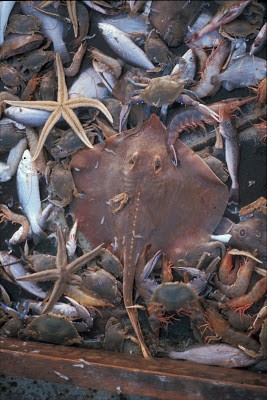 1971年,我在加利福尼亚湾北部海域捕虾渔船上的第一个晚上,弓状Callinectes arcuatus和其他物种(除了虾)占了捕虾拖网捕捞的95%。虾被捞了出来,其余95%的虾被扔到海里(EAN图)。