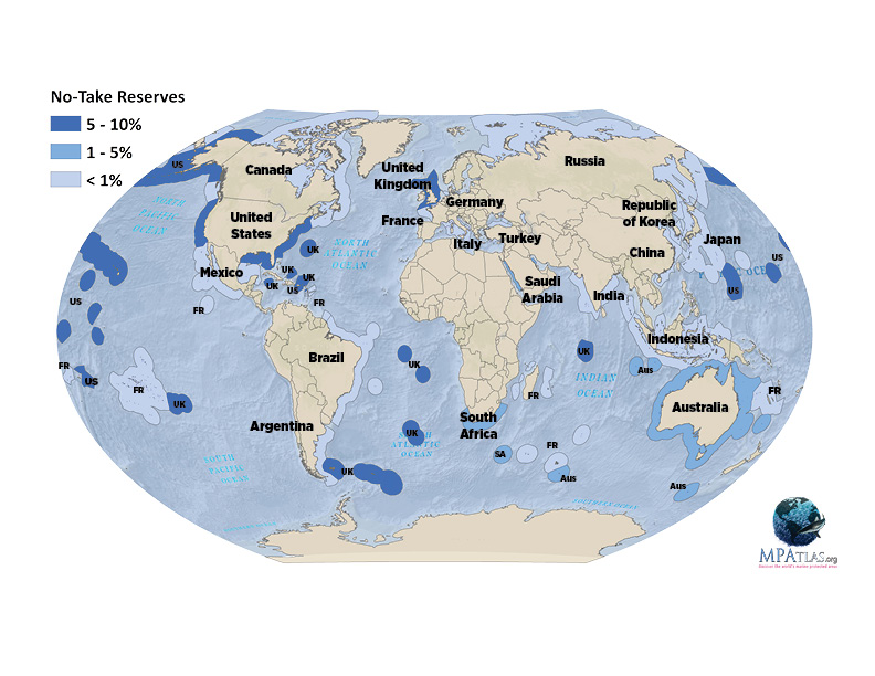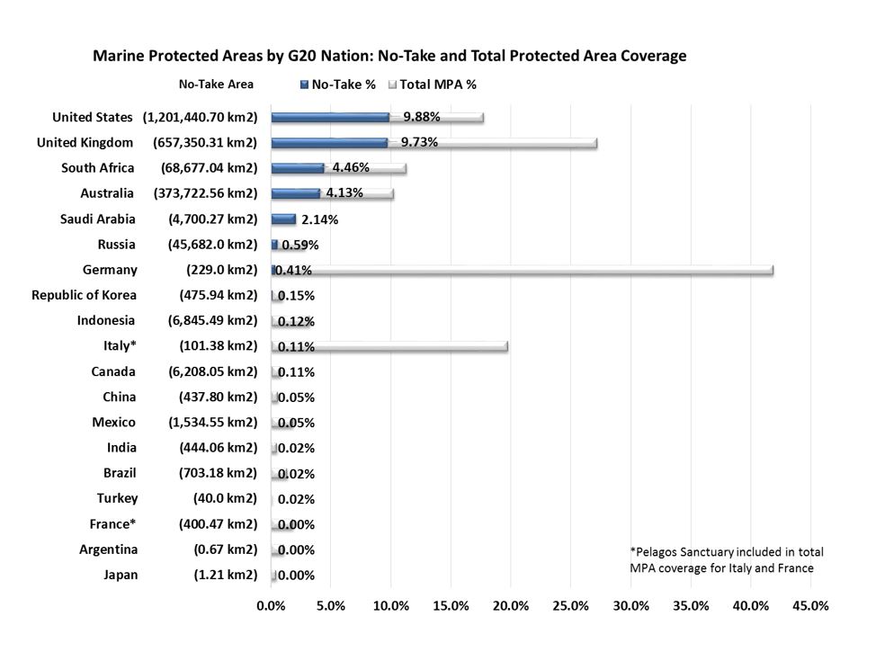 在20国集团成员国中,只有5个国家将其管辖范围内超过1%的海洋区域保护为禁捕保护区。美国以9.88%的高度保护水域领跑,英国以9.73%的高度保护水域紧随其后。南非排名第三,保护率为4.46%,澳大利亚排名第二,保护率为4.13%,沙特阿拉伯排名第五,保护率为2.14%。其余20国集团成员国只有不到1%的海洋得到了强有力的保护:俄罗斯、德国、韩国、印度尼西亚、意大利、加拿大、中国、墨西哥、印度、巴西、土耳其、法国、阿根廷和日本。
