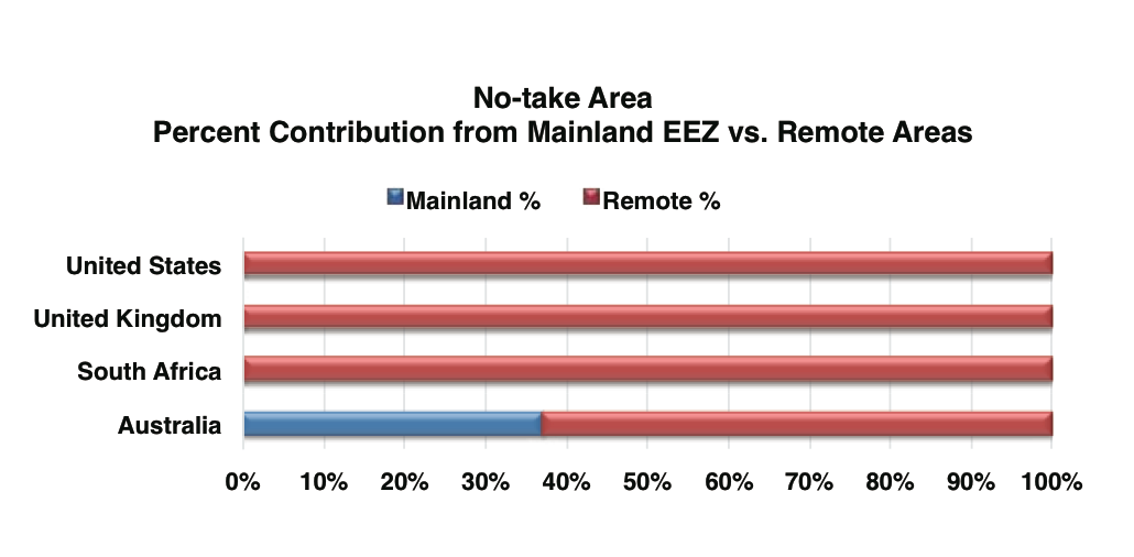 从分析中除去偏远地区,拥有强大海洋保护区的前四个国家依次是澳大利亚、沙特阿拉伯、俄罗斯和德国,尽管这些国家仍有不到4%的水域被保护为禁捕保护区。除去偏远地区,只有澳大利亚和沙特阿拉伯保护了超过1%的水域,其他排名前三的国家(美国、英国和南非)都下降到不足1%。