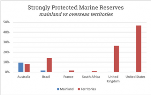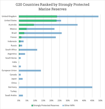 在20国集团的19个国家中,只有6个国家将1%以上的海洋保护成了高度保护的保护区。英国和美国的海洋保护区分别有23.3%和23.1%受到全面保护,领跑各国。在经历了六年的不稳定之后,澳大利亚将于2018年7月正式实施一个全面的海洋公园网络,澳大利亚以9.2%的海洋产业处于禁捕保护区范围内排名第三。排在第四位的墨西哥保护了约4.7%的海洋区域,其中21.9%属于各种形式的海洋保护区。巴西紧随其后,拥有3.3%的海洋资源,其中很大一部分来自圣佩德罗圣保罗和特立尼达马提姆瓦兹两个新的大型环境保护区的禁捕区。排在第六位的是法国,它强力保护了约1.5%的庞大海洋资源。其余20国集团成员国完全保护了不到1%的海洋,包括整个欧盟*,只有0.02%的海洋受到了强有力的保护。