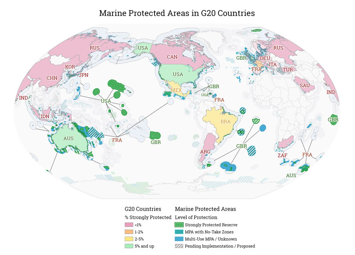 G20成员国是世界上最具财政能力的国家;它们的经济总量约占世界生产总值的85%和世界贸易的80%。然而,除了少数例外,它们缺乏保护沿海水域的承诺,而且能力显然不是问题。《生物多样性公约》(CBD)和联合国可持续发展目标(SDG)要求各国在2020年前通过有效管理、具有生态代表性和连接良好的保护区系统,达到并超过10%的海洋保护区的目标,随着这一期限的临近,世界其他国家肯定在关注富裕的20国集团国家的保护表现。除了欧盟之外,世界上最大的19个经济体在海洋保护方面的领导地位如何?他们是否遵守了保护海洋的长期承诺?他们有办法,他们在尽自己的本分吗?