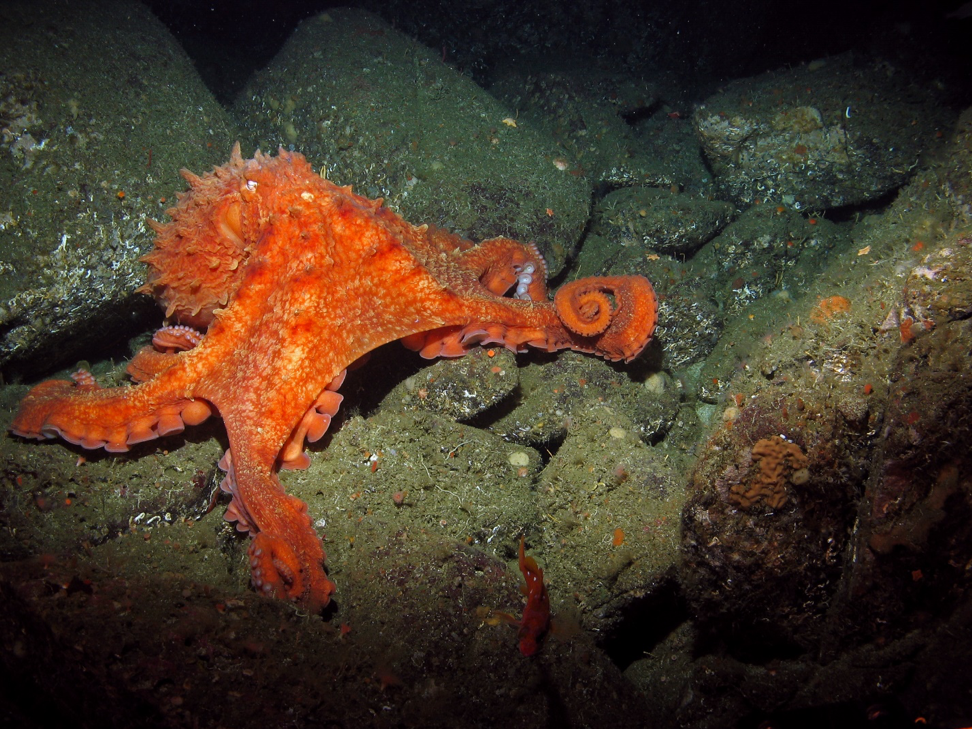 图片:一个巨型太平洋章鱼(Enteroctopus dofleini)观察柯在银行中雷竞技app官方版下载ios和海洋应用研究和探索(母)克鲁斯加州北部海岸。图片来源:母马和美国国家海洋和大气管理局。