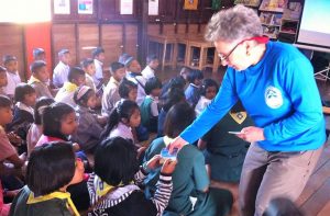 Hines博士手贴在一所小学多短吻海豚达叻,泰国。