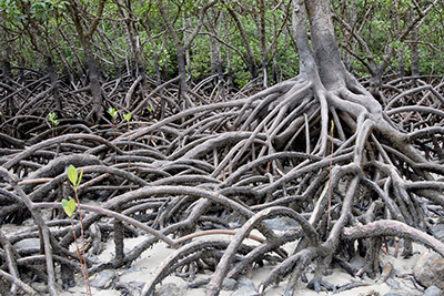 红树林像沿海土地和水咸。这棵树和灌木家庭适应土地和海水之间的一生,有时成长到200英尺高。红树林可以有他们的根浅,盐水,因为他们也暴露在空气中一天的一部分。根部上面利用这段时间水隔离氧气当他们淹没。红树林根创造了地球上一些最具生产力的生态系统,作为他们的交织结构为固着生物提供栖息地藤壶和创建保护幼鱼的托儿所。红树林根提供超过栖息地:他们陷阱沉积物稳定海岸,bio-filtrate营养和污染物的水。这些生态系统是巨大的碳汇,吸收和储存多余的二氧化碳从大气和水面对气候变化的重要属性。