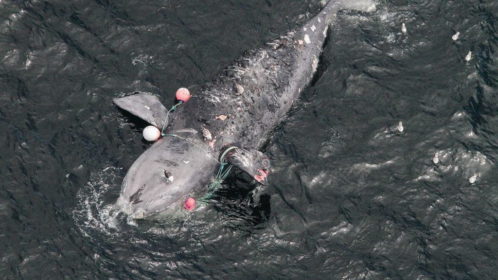 这些令人印象深刻的生物生活在美国和加拿大大西洋沿岸熙攘拥挤的水域,主要由于渔具缠绕和船只撞击,它们面临着不断增加的死亡率。由于气候变化,浮游动物(它们的主要食物来源)的分布也发生了变化。[4],[5],[6]Research indicates that more than 8 of 10 right whales have been entangled in fishing gear at least once and roughly 60% have been entangled more than once.[7] In the North Atlantic, lobster and crab pots, which use heavy vertical ropes to connect pots on the seafloor to buoys on the surface, are the culprit for entanglement. Even if getting tangled in fishing gear is not fatal, dragging heavy ropes around has significant costs. A recent study found that North Atlantic right whales are in worse body condition than their close relative, the southern right whale, as dragging heavy ropes costs energy, causes stress, and can lead to injuries and infections.[8]