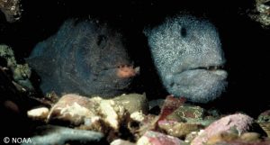 一对狼鳗在洞穴里。照片:AK渔业科学中心,NOAA