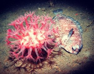蒙特利湾国家海洋保护区350米深的蘑菇软珊瑚和多佛比目鱼。照片:母马
