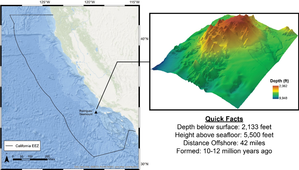 罗德里格斯海底山是一个10 - 12年前的海底山位于南加州海岸约42英里。塔在一英里以上海底,其最高峰会锥站在下方2000英尺多一点。曾几何时,罗德里格斯是一个岛站在高海拔230米,面积2.6平方公里。像邻近的圣胡安海底山,它已经沉没在波涛很大程度上是由于海洋地壳下的沉降。由于侵蚀力量被暴露在一个岛屿,现代峰会主要由一个大型平坦的圆顶,排位赛罗德里格斯作为平顶山——一个平顶海底山。平顶山,瑞士地理学家的名字命名的阿诺德平顶山在我们的海洋,是相对罕见,科学家估计有近10000年海山,但只有283平顶山。