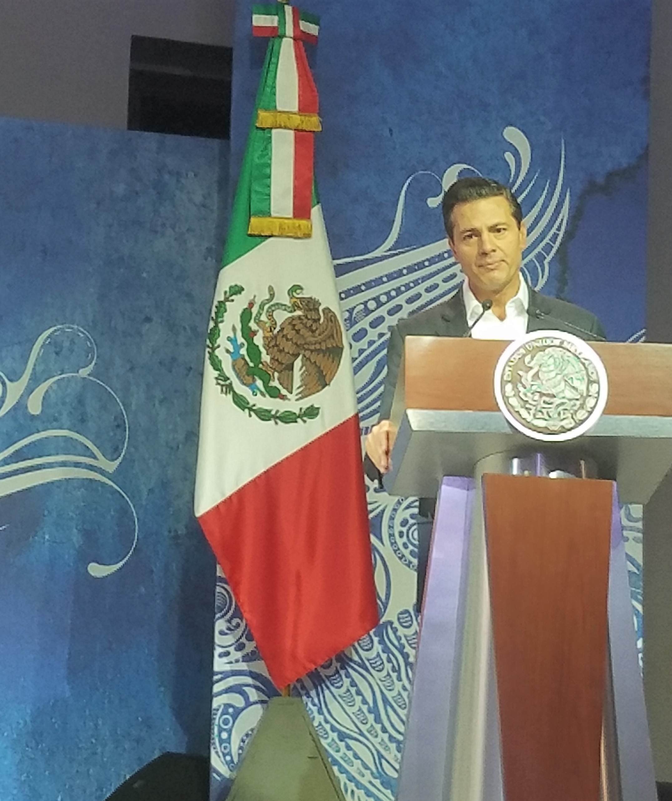 “要成功你必须涉及各方,让他们参与我们的原因。这是一个斗争,承诺我们所有人,这次峰会汇集了各国政府、商人、学者和公民社会的领导人是一个明显的例子。从墨西哥加勒比海,一个世界上最美丽的海,我号召所有人参与保护我们的海洋和海洋的使命,同时保持开发与保护环境之间的平衡。”