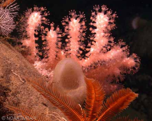 功能图:Octocoral、海绵和羽毛星戴维森海底山,NOAA / MBARI。