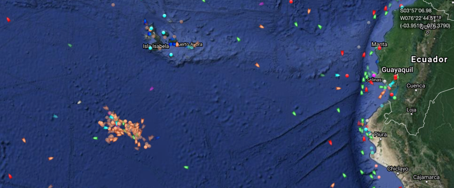 从卫星的角度来看,这似乎是无害的:在厄瓜多尔东部广阔的蓝色海洋中,一个彩虹色的星团比一个拇指指纹还小。但在水平面上,地图上那些明亮的小针代表了一支庞大的捕鱼船队,在加拉帕戈斯群岛以南延伸了300多英里——几乎是加拉帕戈斯群岛本身长度的两倍。在过去的几个夏天里,当凉爽的洪堡海流为丰富的海洋生物提供燃料时,以中国渔船为主的庞大船队在Galápagos海洋保护区外排队。Galápagos海洋保护区是联合国教科文组织的世界遗产,也是查尔斯·达尔文进化论的诞生地。