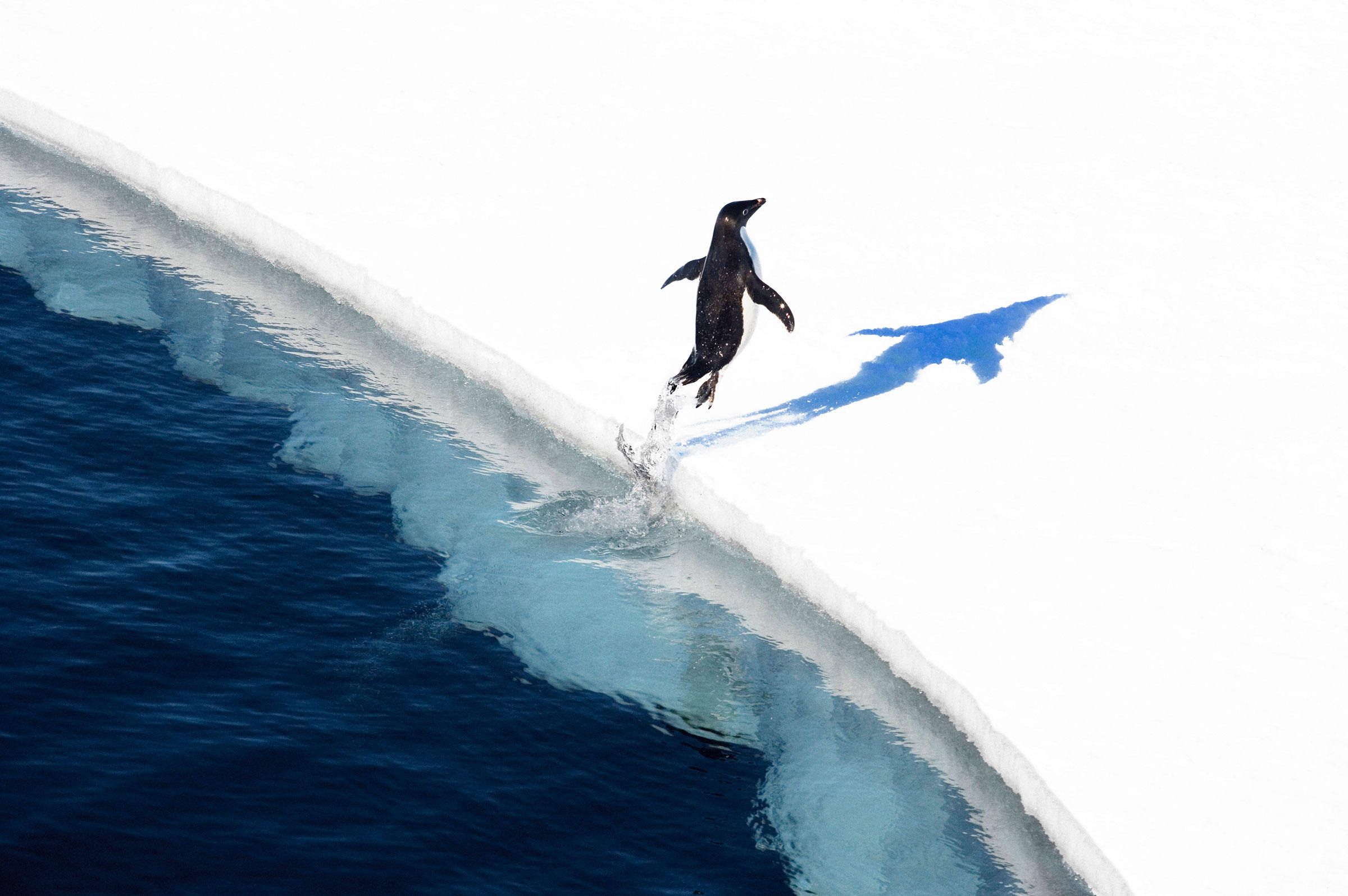 阿德利企鹅跳上冰。照片:约翰·韦勒