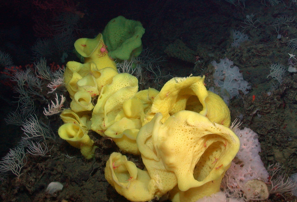 图片:黄色毕加索海绵和白色海绵戴维森海底山。图片由NOAA和他。