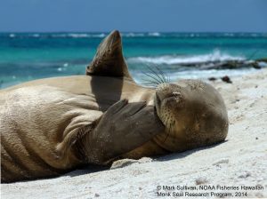 一只年轻的夏威夷僧海豹在帕帕哈(papahahnaumokukukea)海洋国家纪念碑的法国护卫舰浅滩的特恩岛的海滩上休息。照片:马克·沙利文,美国国家海洋和大气管理局渔业夏威夷僧海豹研究项目,2014年