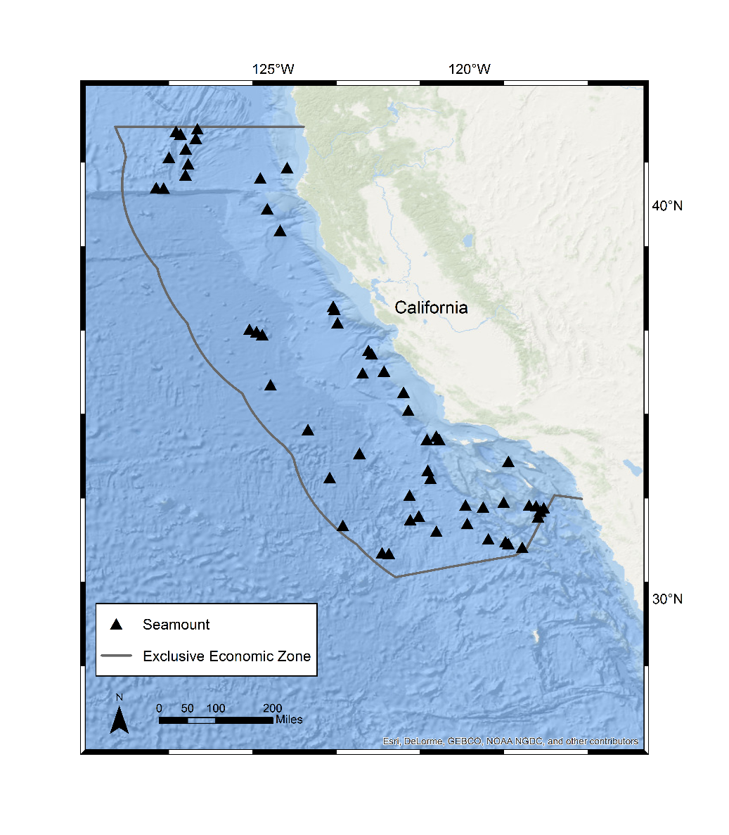 在加州海岸的深海潜艇存在山数千英尺的海底和海港了海洋生物的多样性。这些水下山脉被称为海山的水下山脉中经典定义为海底特性比1000米(3300英尺)高,有陡峭的,大致圆形或者椭圆形的。1是加州最大的海底山水域戴维森海底山达到惊人的7480英尺高,而其峰会仍低于海平面4101英尺。通常是海山火山的起源、形成了巨大的海底熔岩喷发。在许多情况下,这些火山沉积一旦上升高到足以破坏表面,形成岛屿(例如,夏威夷群岛),但后来下方的波因侵蚀或下沉。最近的地质评价的九个加州非常意外地发现他们主要形成火山喷发时发生7至1600万年前,与最近的海底山形成于280万年前。2在全球范围内,超过30000人已发现海山,3在加利福尼亚海域56山已确定在专属经济区(EEZ),扩展了离岸200海里(图1)。4、5